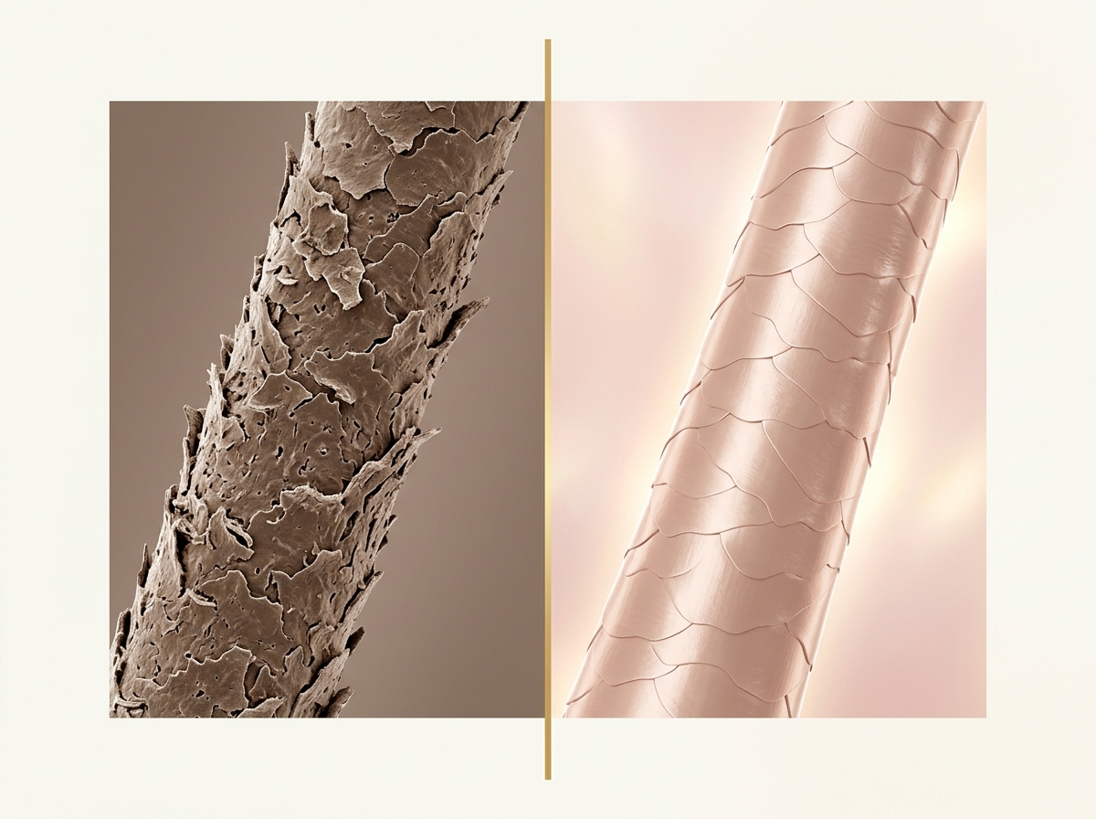 Молекула гидролизованного фиброина достаточно мала, чтобы проникнуть в кортекс — внутренний слой волоса. Там она встраивается в повреждённые участки, восстанавливая целостность структуры. Это не «склеивание» снаружи, а именно заполнение изнутри.